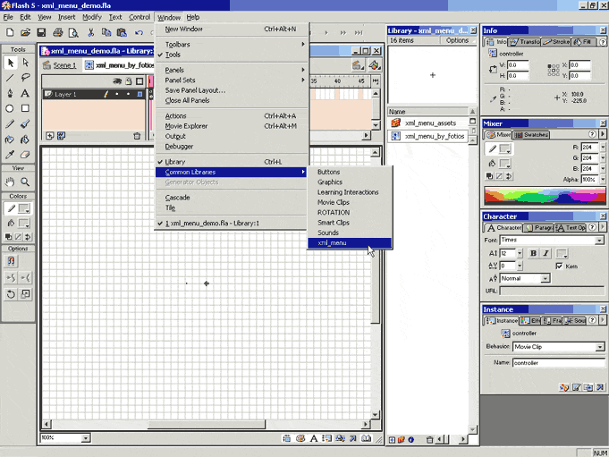 A couple of days ago I finished coding the xml_menu smart clip which I packaged and submitted, as a Flash extension, to Macromedia. This tutorial is meant to give some idea, to anyone interested, of how such a menu system can be built using Flash's ActionScript. Full code of the smart clip is available when you download the xml_menu Flash extension from the Macromedia site; this tutorial will only present the portions of code that constitute the heart of the smart clip. The following paragraphs give you some idea of what xml_menu does. The rest of the sections in this page explain how it is done (don't expect anything close to a 'step by step newbie guide though).